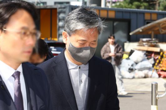 드라마제작사 고가 인수 의혹을 받는 김성수 카카오엔터테인먼트 대표가 서울 양천구 서울남부지방법원에서 열린 영장실질심사(구속 전 피의자 심문)에 출석하고 있다.(사진=뉴시스) |