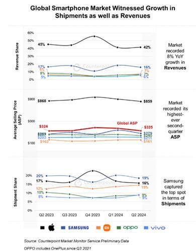 카운터포인트리서치는 2분기 전 세계 스마트폰 출하량이 작년 2분기보다 8% 성장한 2억8천910만 대를 기록했다고 밝혔다. 매출액도 같은 기간 8% 성장했다.