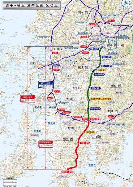 광주-완도 고속도로 총연장은 90.01km이며, 3조4천여억 원이 투입되는 대규모 사업이다.