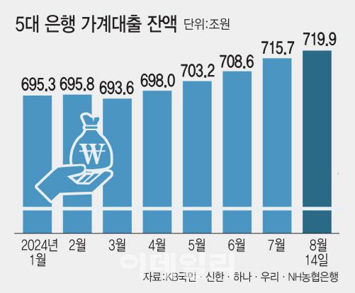 은행들의 ‘인위적 조정’에도 가계대출 증가세는 꺾일 기미를 보이지 않고 있다. 5대 은행의 가계대출 잔액은 14일 기준 719조9178억원으로, 이달 들어 채 보름도 지나지 않아 4조1795억원 더 불었다.