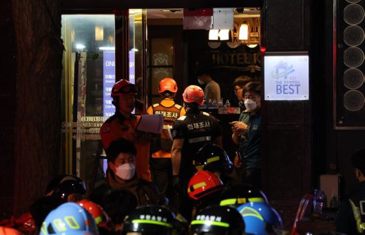 큰 불로 인명피해가 난 경기 부천 원미구의 한 호텔에서 23일 자정 화재조사 요원들이 호텔 입구로 들어가고 있다. 김태형 기자 xogud555@hani.co.kr |