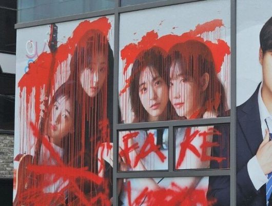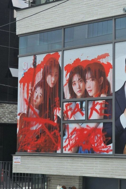 공개된 사진에는 서울시 강남구에 위치한 3Y코퍼레이션 사무실 외벽에 붙은 QWER 멤버들쵸단, 마젠타, 히나, 시연)의 사진 위에 붉은 색 페인트가 마구 칠해져 있어 보는 이들을 놀라게 한다.