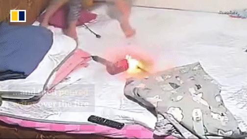 [서울=뉴시스]최인선 인턴 기자 = 중국에서 8살 아이가 침대에 옮겨붙은 불을 완벽하게 끄는 모습이 공개돼 화제다.