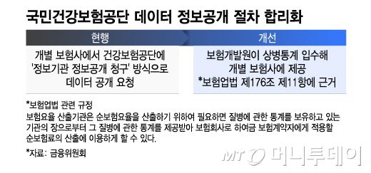 앞으로는 보험개발원이 건보공단으로부터 질병 통계를 받고, 다시 보험사에 제공하는 방식으로 개선할 계획이다. 보험개발원은 보험업법 제176조 제11항에 근거해 건보공단에 질병 통계를 요청할 수 있다. 일일이 정보공개 청구를 해야 하는 번거로움과 여러 보험사가 중복된 자료를 요청하는 등의 비효율이 개선될 것으로 기대된다.