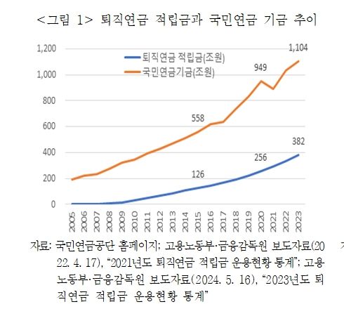 우리나라 퇴직연금은 최근 들어 연간 40~50조원 증가하면서 지난해 국민연금 기금의 38% 수준인 382조원에 이른다. 국민연금 기금도 가파른 상승세를 보이나 베이비부머 수급자가 많아지고 저부담·고급여의 구조적 문제가 나타나면서 국민연금 기금은 2041년을 정점으로 하락한 후 2055년 소진되는 것으로 연구원은 추계했다.