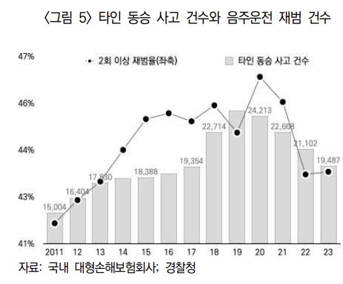 이같은 주장은 통계적으로 뒷받침된다. 피보험자 본인이 포함된 자동차보험 청구건 중 타인 동승자가 탑승한 사고비율은 2001년에서 2023년까지 줄어들고 있고 혼자 운전 중 사고가 발생한 비율은 늘어나고 있다. 그런데 동승자 사고비율과 음주운전 사고비율이 같은 추세를 보이고 타인 동승 사고비율과 음주운전 사고비율 사이에 정의 선형관계가 있다. 이는 타인 동승자가 있는 경우 음주운전으로 이어질 가능성이 높다는 점을 의미한다는 것이다.