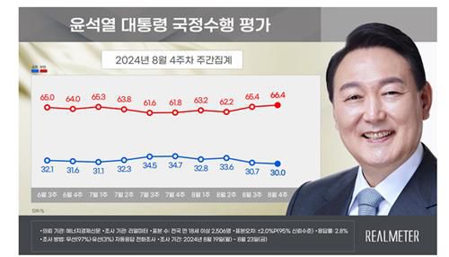 국정 수행 부정 평가는 일주일 전보다 1.0%p 오른 66.4%로 나타났다.