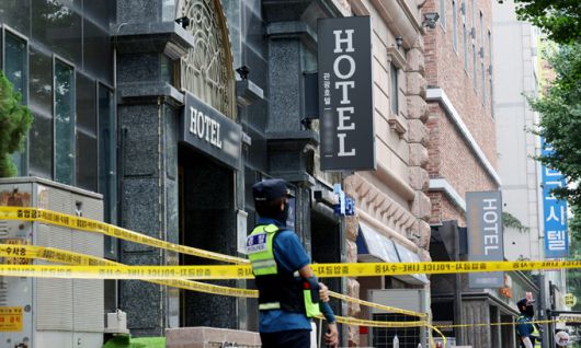 지난 24일 경기 부천시 중동 호텔에서 경찰이 현장을 통제하고 있다. 지난 22일 이곳 호텔에서 발생한 화재로 7명이 숨지고 12명이 다쳤다. 연합뉴스 |