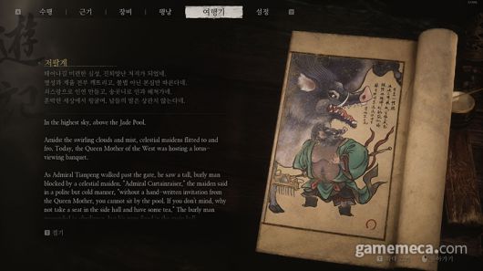 다만 이와 별개로 번역 측면에서는 미흡한 모습을 보이고 있다. ‘여행기’ 메뉴 내 ‘영신도’에서는 등장하는 요괴들의 배경 설정을 확인할 수 있는데, 그 중 일부가 아직까지 미번역인 상태다. 해당 항목을 살펴보면 한국어로 “송구합니다. 이 이야기는 번역 중이오니 조금만 기다려주시지요”라는 문구를 발견할 수 있다.;