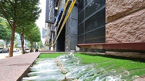 화재로 19명의 사상자가 발생한 경기 부천 호텔 앞에 지난 25일 희생자의 명복을 비는 국화꽃이 놓여 있다. 연합뉴스 제공 |