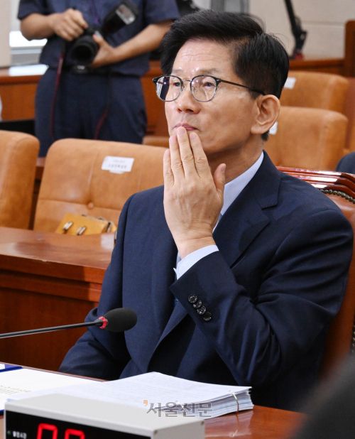 김문수 고용노동부 장관 후보자가 26일 국회 환경노동위원회에서 열린 인사청문회에 출석해 얼굴을 만지며 정면을 응시하고 있다. 이날 청문회에서는 여야가 김 후보자의 과거 발언 논란 등을 놓고 공방을 벌이면서 개의 40분 만에 정회됐다. 안주영 전문기자 |