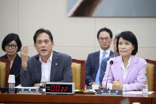 지난 14일 오후 서울 여의도 국회에서 열린 방송문화진흥회(MBC 대주주) 새 이사 선임과 관련한 청문회에 출석한 이진숙(오른쪽) 방송통신위원장과 김태규 부위원장이 민주당 의원들 질문에 답하고 있다. 이 위원장 등이 임명한 방문진 새 이사 6명에 대해 법원은 26일 임명 절차에 문제가 있다 효력 정지 결정을 내렸다./뉴스1 |