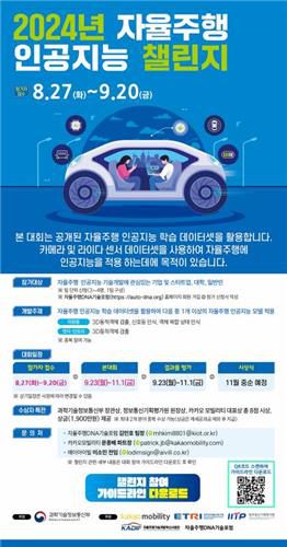 ▲ 과학기술정보통신부는 올해 '자율주행 인공지능 챌린지' 참가자를 다음 달 20일까지 모집한다고 27일 밝혔다. 실제 도로 환경에 기반한 학습 데이터와 자율주행 AI 모델을 제공한 뒤 우수한 자율주행 AI 소프트웨어 개발 여부를 겨루는 이 행사에서는 총 8팀의 수상팀을 선정해 총 1천900만원 규모의 상금을 수여한다. (서울=연합뉴스)