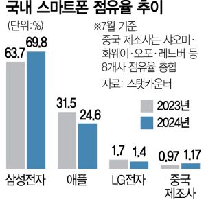 시장조사업체 스탯카운터에 따르면 국내 시장에서 삼성전자는 7월 기준 69.8%의 압도적인 점유율을 기록 중이다. 애플은 지난해 7월 31.5%에서 1년 새 24.6%로 위축됐지만 여전히 삼성과 양강 구도를 유지 중이다. 중국 제조사들의 경우 8개 사의 점유율 총합이 1%대에 불과하지만 명맥을 유지하는 중이다.