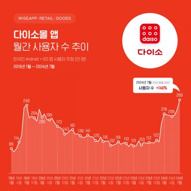 이는 다이소몰 앱 출시 이후 역대 최대치라고 와이즈앱은 설명했다. 지난해 10월 122만명 수준이던 다이소몰 앱의 사용자 수는 올해 1월 들어 218만명까지 급증했고, 지난달 269만명까지 늘었다. 이전까지 다이소 앱의 최다 사용자 수 기록은 2019년 7월의 249만명이었다.