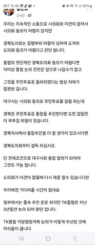 이어 "통합의 첫 단계인 경북도의회 동의가 어렵다면 더 이상 통합 논의 진전은 앞으로 나갈 수가 없고 그것을 주민투표로 돌파하겠다는 발상 자체가 잘못된 것"이라고 주장했다.