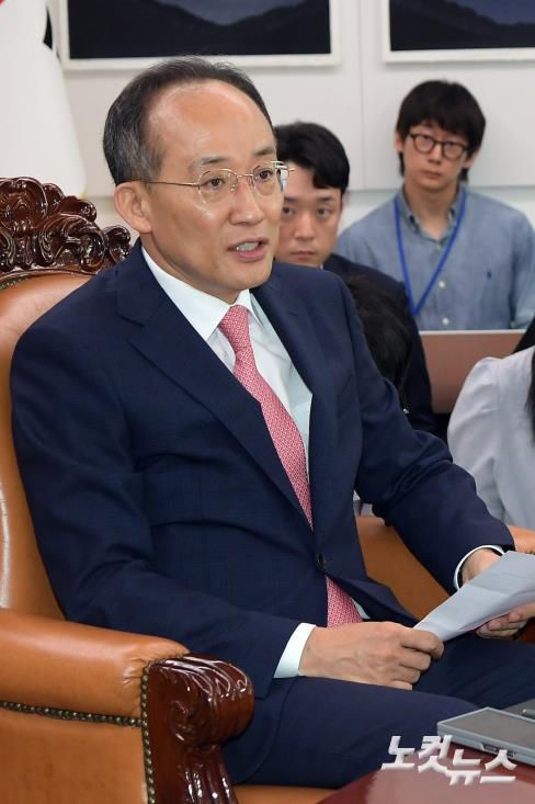 추경호 국민의힘 원내대표가 28일 서울 여의도 국회에서 열린 우원식 국회의장 주재 여야 원내대표 회동에서 발언을 하고 있다.