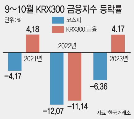 그간 9월부터 10월까지 고배당주의 성과가 긍정적이었던 것도 투자자들의 주목을 이끌고 있다. 한국거래소 정보데이터시스템에 따르면 밸류업 테마주의 핵심인 주요 금융사를 추종하는 KRX 300 금융 지수는 지난 3년간 코스피 지수 대비 긍정적인 흐름을 보였다.