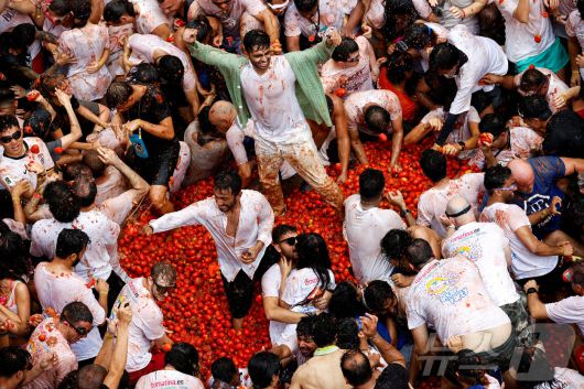 (서울=뉴스1) 김예슬 기자 = 스페인에서 세계적인 토마토 축제가 시작되며 거리가 붉게 물들었다.
