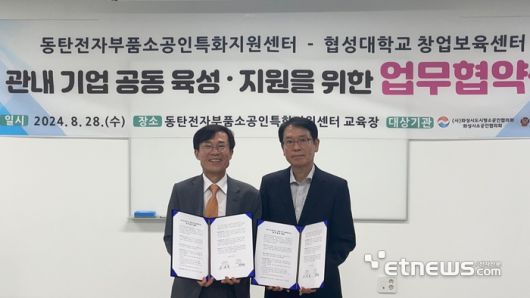 정도철 협성대 창업보육센터장(오른쪽)과 문재범 동탄전자부품소공인특화지원센터장이 28일 관내 기업 공동 육성 및 지원을 위한 업무 협약을 체결했다.