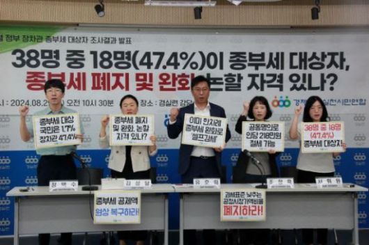 경실련은 "윤석열 정부가 종부세 기본 공제액을 인상하고, 지난 6월17일에는 폐지를 발표한 이유는 극소수의 슈퍼리치를 위한 감세 정책"이라며 "소수 특정 계층을 위한 정책을 추진하며 서민을 위한 정책은 뒤로 밀려나고 있다"고 강조했다.