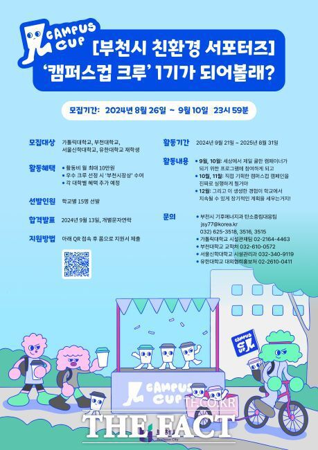 [더팩트|부천=김동선 기자] 경기 부천시는 관내 4개 대학교(가톨릭대·부천대·서울신학대·유한대) 학생을 대상으로 친환경 서포터스인 ‘캠퍼스컵 크루’ 1기 60명(학교별 15명)을 9월 10일까지 온라인으로 모집한다.