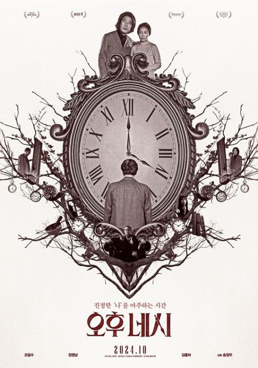 공개된 '오후 네시' 런칭 포스터에서 커다란 시계를 중심으로, 평화로운 전원생활을 꿈꾸는 부부 정인(오달수)과 현숙(장영남)이 매일 그들의 집을 방문하는 불청객 육남(김홍파)과 대치하고 있는 구도는 긴장감 넘치는 대립을 예고한다.