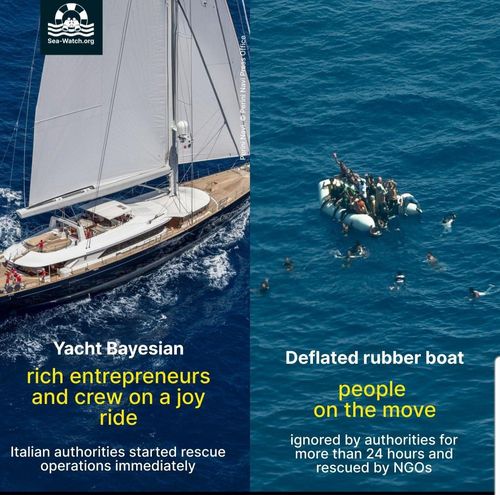 이 단체는 SNS 계정에 베이지언호와 난민보트 사진을 함께 올리며 "유흥을 위해 부유한 기업가들이 탄 요트는 이탈리아 당국이 즉각 구조에 나섰고 바람 빠진 고무보트는 24시간 넘게 방치되다 NGO에 구조됐다"는 글을 올렸다.