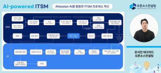 이어진 발표에서 오픈소스컨설팅의 은서진 솔루션 아키텍트가 아틀라시안 도구를 활용한 IT 서비스 관리(ITSM) 프로세스와 인공지능(AI) 기능의 통합 시나리오를 시연했다.그는 ITSM 변경관리 프로세스에 초점을 맞추어, 기업들이 어떻게 아틀라시안 솔루션과 AI를 결합해 효율성과 정확성을 높일 수 있는지에 대해 시연됐다.