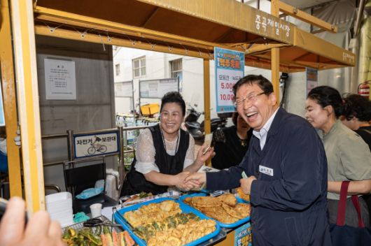 김경호(가운데) 서울 광진구청장이 중곡제일골목시장에서 상인과 악수하고 있다. 광진구 제공 |