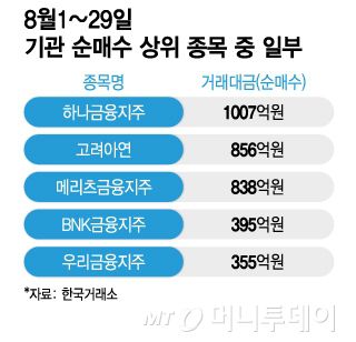31일 한국거래소에 따르면 이달(8월1일~8월29일) 들어 기관이 순매수한 상위 종목에는 하나금융지주(1007억원), 메리츠금융지주(838억원), BNK금융지주(395억원), 우리금융지주(355억원) 등 금융주가 다수 포진됐다. 같은 기간 외국인도 신한지주를 965억원어치 순매수했다.