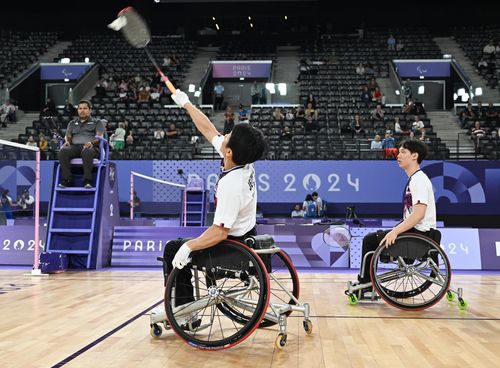 (파리=연합뉴스) 김경윤 기자 = 장애인 배드민턴 정재군(47·WH1·울산중구청)-유수영(21·WH2·한국장애인고용공단) 조가 1일(한국시간) 프랑스 파리 포르트드라샤펠 경기장에 열린 2024 파리 패럴림픽 배드민턴 남자복식(WH1, 2등급) 4강전에서 일본의 마쓰모토 다쿠니-나가시마 오사무 조를 세트스코어 2-0(21-12 21-12)으로 가볍게 제압하며 결승에 진출했다.