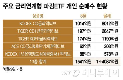 1일 금융투자업계에 따르면 국내 증시에 상장된 13종의 금리연계형 파킹 ETF(상장지수펀드)에 8월 한 달(이하 1~29일 기준) 동안 1541억원의 개인 자금이 순유입됐다.
