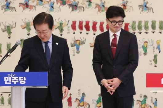 두 대표는 회동에 앞서 공개된 모두발언에선 금투세의 보완 필요성을 언급하며 협의 가능성을 열어뒀다. 한 대표는 “자산 형성의 사다리를 더 많이, 더 쉽게 만들어야 한다. 금투세를 폐지하는 데 국민이 집중하는 건 그런 이유”라고 했고, 이 대표도 “대한민국 주식시장이 비정상이기 때문에 세계 대부분의 국가가 갖고 있는 금투세를 지금 적용하면 안 그래도 비정상인 대한민국 주식시장이 문제가 생길 수 있으니 이것을 교정하고 보완하자는 차원”이라고 했다.
