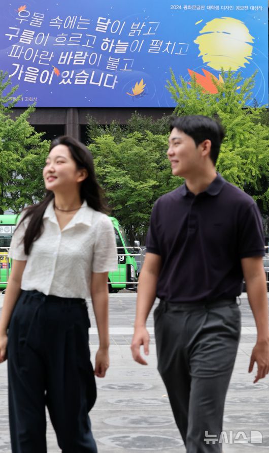 [서울=뉴시스] 배훈식 기자 = 2일 오전 서울 종로구 교보빌딩 외벽 광화문글판에 윤동주 시인의 시 '자화상'의 구절이 적혀있다. 이번 문구는 2024 광화문글판 대학생 디자인 공모전 대상작인 홍산하(추계예술대학교·21) 씨의 작품이다. 2024.09.02. dahora83@newsis.com