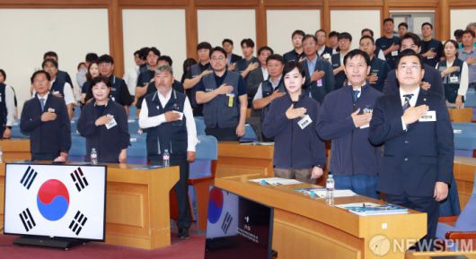 [서울=뉴스핌] 이형석 기자 = 박찬대 더불어민주당 원내대표(오른쪽)를 비롯한 참석자들이 2일 오전 서울 여의도 국회 의원회관에서 열린 노동존중실천단 출범식에서 국기에 대한 경례를 하고 있다. 2024.09.02 leehs@newspim.com