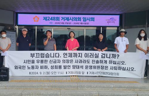 (거제=연합뉴스) 이준영 기자 = 경남 18개 시군 의회 중 유일하게 후반기 원 구성을 하지 못한 거제시의회의 내홍이 깊어지는 가운데 거제지역 시민사회단체가 여야 정당의 책임 있는 자세를 촉구하고 나섰다.