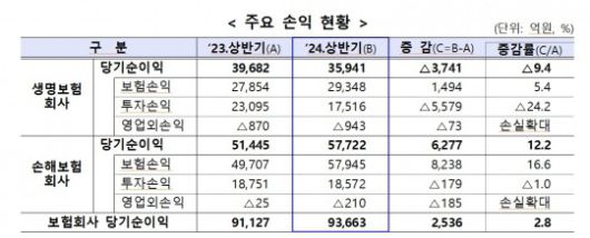 2일 금융감독원이 발표한 '2024년 상반기 보험회사 경영실적'에 따르면, 상반기 생보 순익은 3조5941억원으로 전년동기대비 9.4% 감소한 반면, 손보 순익은 5조7722억원으로 전년동기대비 12.2% 증가했다.