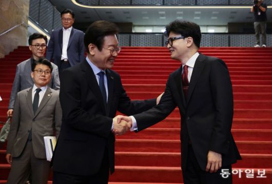 1일 오후 서울 여의도 국회에서 국민의힘 한동훈 대표와 더불어민주당 이재명 대표가 회담을 마친 뒤 각당 당대표실로 향하기 전 악수하고 있다. 박형기 기자 oneshot@donga.com |