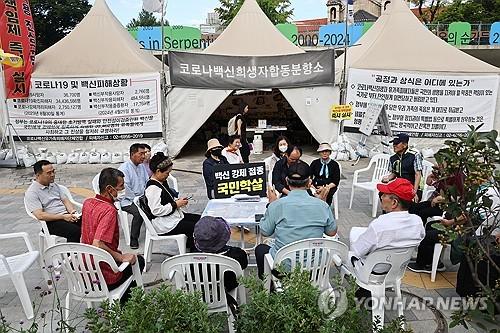 (서울=연합뉴스) 김기훈 기자 = 서울 중구 서울시의회 앞에 3년 넘게 농성 중인 '코로나19 백신 희생자 합동분향소'를 철거하려던 중구의 계획이 미뤄지게 됐다.