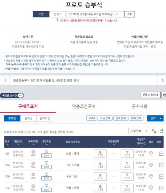 이번 프로토 승부식 107회차의 'SUM' 유형과 발매시간 변경 시행, KBO 더블헤더 2차전 발매 등에 대한 자세한 사항은 스포츠토토 홈페이지 및 공식 인터넷 발매사이트 베트맨에서 확인할 수 있다.