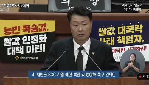 (전주=연합뉴스) 임채두 기자 = 김동구 전북특별자치도의회 의원(군산 2)은 3일 "국토교통부는 삭감된 새만금 사회간접자본(SOC) 예산을 복원하고 잃어버린 8개월을 보상해야 한다"고 촉구했다.