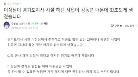 이재명 더불어민주당 대표의 팬 커뮤니티 ‘재명이네 마을’에 지난달 25일 올라온 게시글의 일부다. 최근 이 대표 지지층의 커뮤니티에선 “김동연 경기지사를 국정감사 해달라”는 주장이 부쩍 늘고 있다. 5년 전부터 추진되던 경기도의 K컬처밸리 사업의 계약이 지난 6월 28일 돌연 해지됐다는 이유에서다. 국회 청원게시판에 올라온 ‘경기도의 K컬처밸리 사업 계약 일방 해지 관련 국정감사 요청 청원’은 3일 오후 3시 기준 5만888명을 기록했다. 김 지사가 ‘이재명 지우기’에 나섰다고 여기는 이 대표 지지자가 대거 참여했다는 것이 정치권의 시각이다.