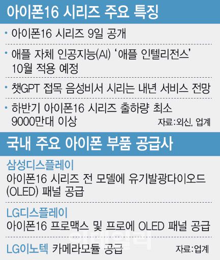 [이데일리 김응열 기자] 애플 아이폰 신제품 출시가 코앞으로 다가오면서 국내 부품사들도 기대감이 부풀고 있다. 자체 인공지능(AI) 기능인 ‘애플 인텔리전스’를 도입할 전망인 데다 올해는 아이폰 교체 수요까지 대거 몰려 있어서다.
