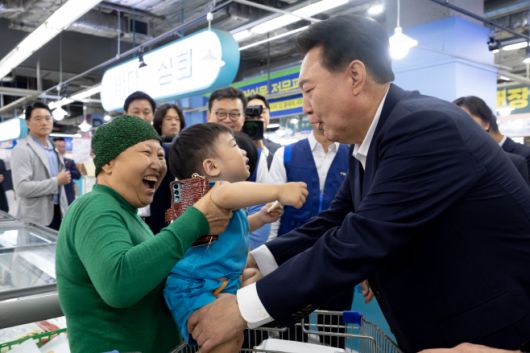 윤석열 대통령이 추석 명절을 앞두고 3일 서울 도봉구 농협 하나로마트 창동점을 찾아 물가 점검을 하던 중 마트를 찾은 가족과 인사하고 있다. /제공=대통령실 |