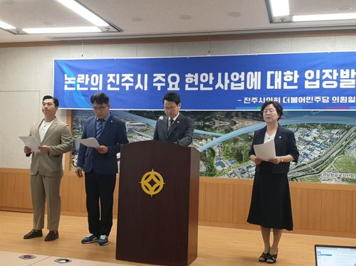 (진주=연합뉴스) 박정헌 기자 = 경남 진주시의회 더불어민주당 시의원들이 4일 진주시청 브리핑룸에서 기자회견을 열고 진주대첩역사공원과 폐기물 소각장 등 지역 현안에 대해 시민과 소통하며 사업 추진을 해야 한다고 시에 촉구했다.
