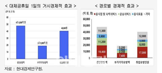 현대경제연구원은 지난해 3월 ‘대체공휴일 지정 효과, 정책 노력에 달렸다’는 제하의 보고서에서 대체공휴일 1일의 경제 전체 소비지출액을 2조 4000억원으로 추정했다. 대체공휴일 1일 1인당 소비지출액을 8만 5830원으로 가정한 추산이다. 임시공휴일은 필요에 따라 정부가 정해 쉬는 날이며 대체공휴일은 공휴일과 휴일이 겹치면 다음날인 비공휴일을 공휴일로 지정하는 제도다.