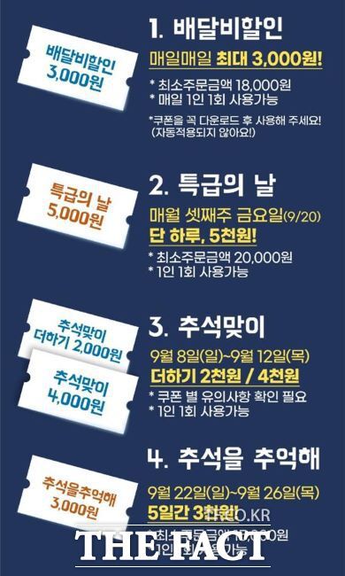 프로모션은 셋째 주 금요일인 20일에 5000원 쿠폰을 제공하는 '부천시 특급의 날', 3000원 쿠폰을 제공하는 '배달비 지원', 4000원 쿠폰과 더하기 2000원 쿠폰을 제공하는 '추석맞이 지원', '추석을 추억해' 3000원 쿠폰 등이 있다.