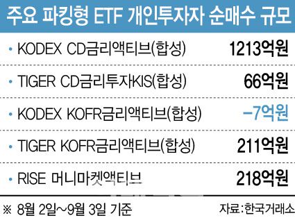 4일 한국거래소에 따르면 최근 한 달(3일 기준) 개인 투자자는 파킹형 ETF 가운데 가장 규모가 큰 ‘KODEX CD금리액티브(합성)’를 1213억원 규모 순매수한 것으로 집계됐다. 해당 ETF는 CD91일물 하루치 금리를 매일 이자수익으로 반영하는 상품으로, 하루만 투자해도 CD91일물 하루 금리를 수익으로 받을 수 있다.