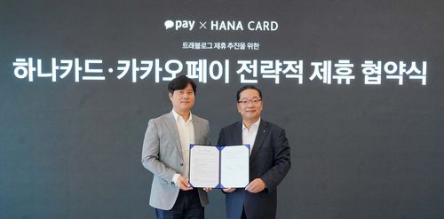 ▲ 카카오페이[377300]는 지난 4일 경기도 판교 오피스에서 신원근 대표와 이호성 하나카드 대표가 참석한 가운데 하나카드와 신상품 개발 등을 위한 업무협약을 체결했다. 협약에 따라 양사는 하나카드의 트래블로그 체크카드(해외여행 특화 카드)와 카카오페이의 선불전자지급수단인 카카오페이머니의 강점을 결합해 시중은행은 물론 인터넷은행, 저축은행, 증권사 계좌까지 자유롭게 연결할 수 있는 신상품을 개발할 계획이다. (서울=연합뉴스)